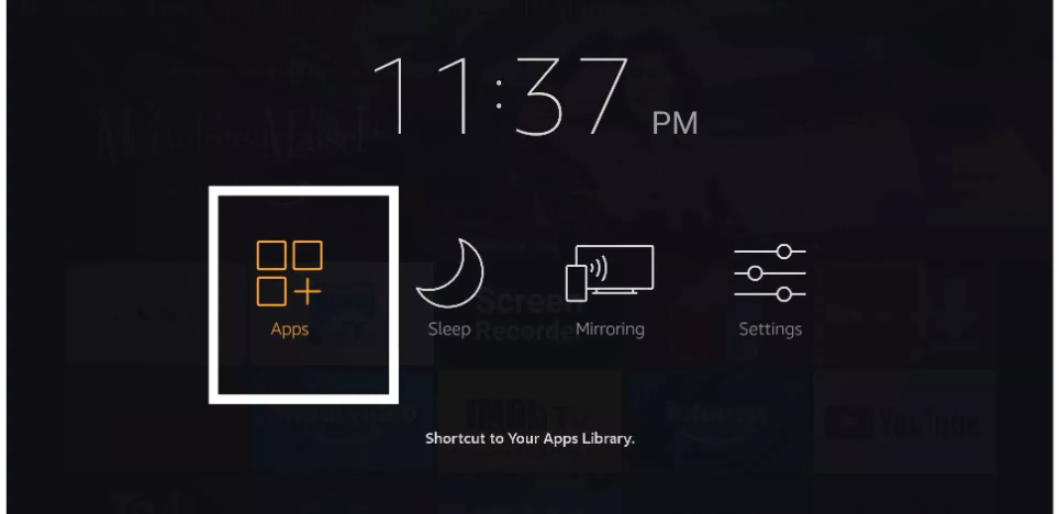 Avvia IPTV Smarters su Firestick accedendo alla sezione Le tue app e canali o tenendo premuto il pulsante Home, quindi seleziona App dalla schermata successiva.