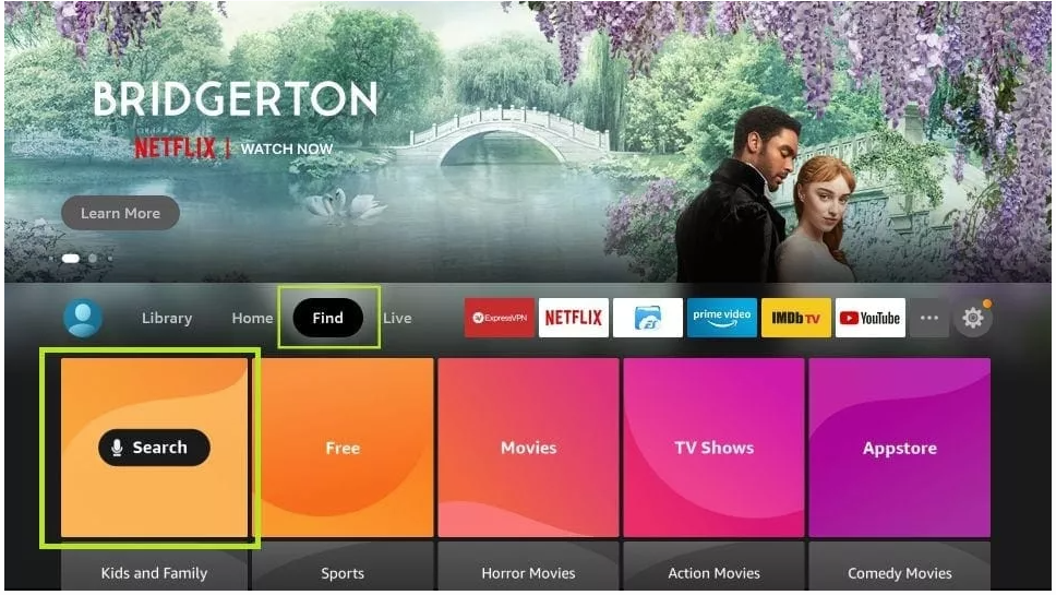 2. Fare clic sull’opzione Trova > Cerca nella schermata principale di FireStick